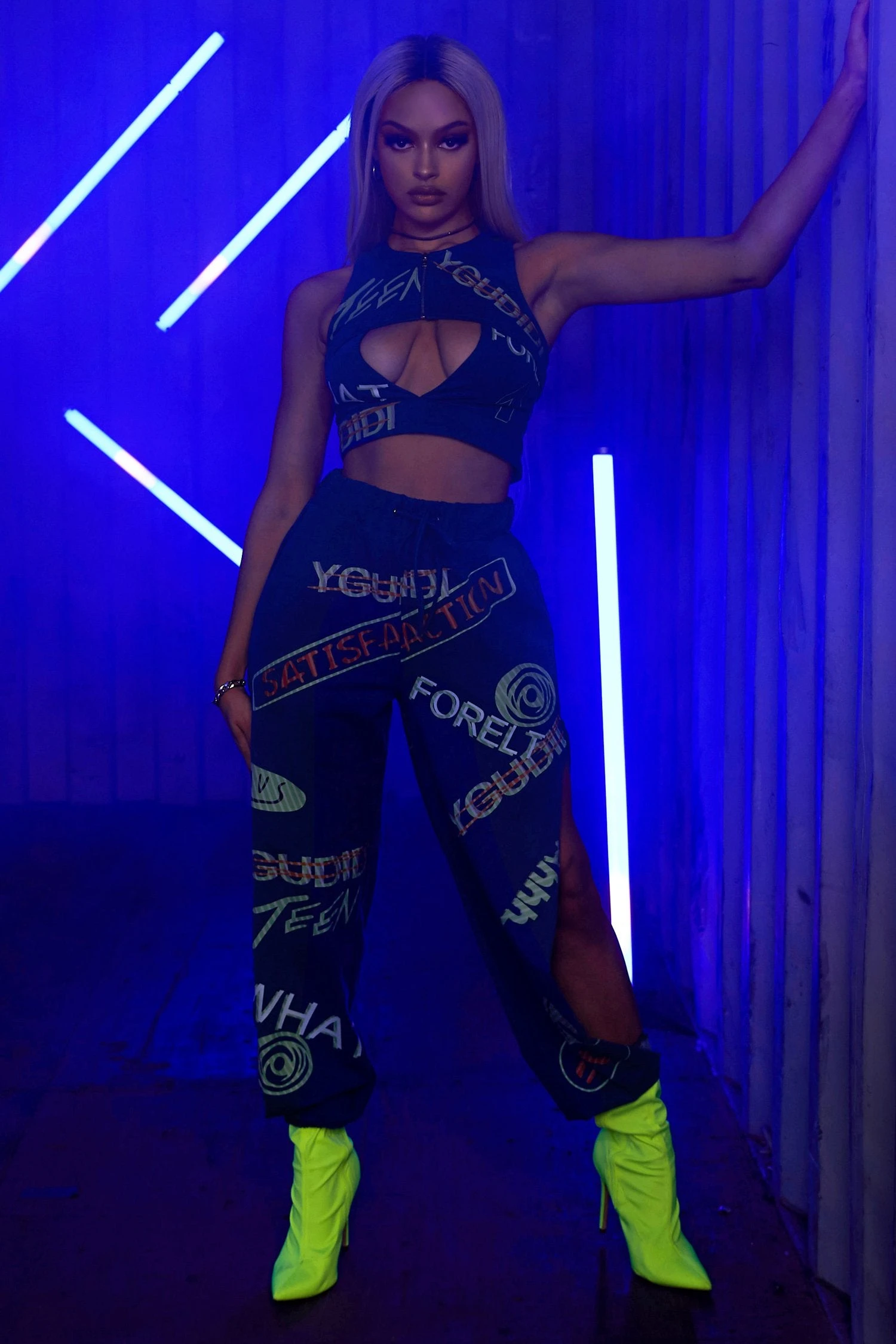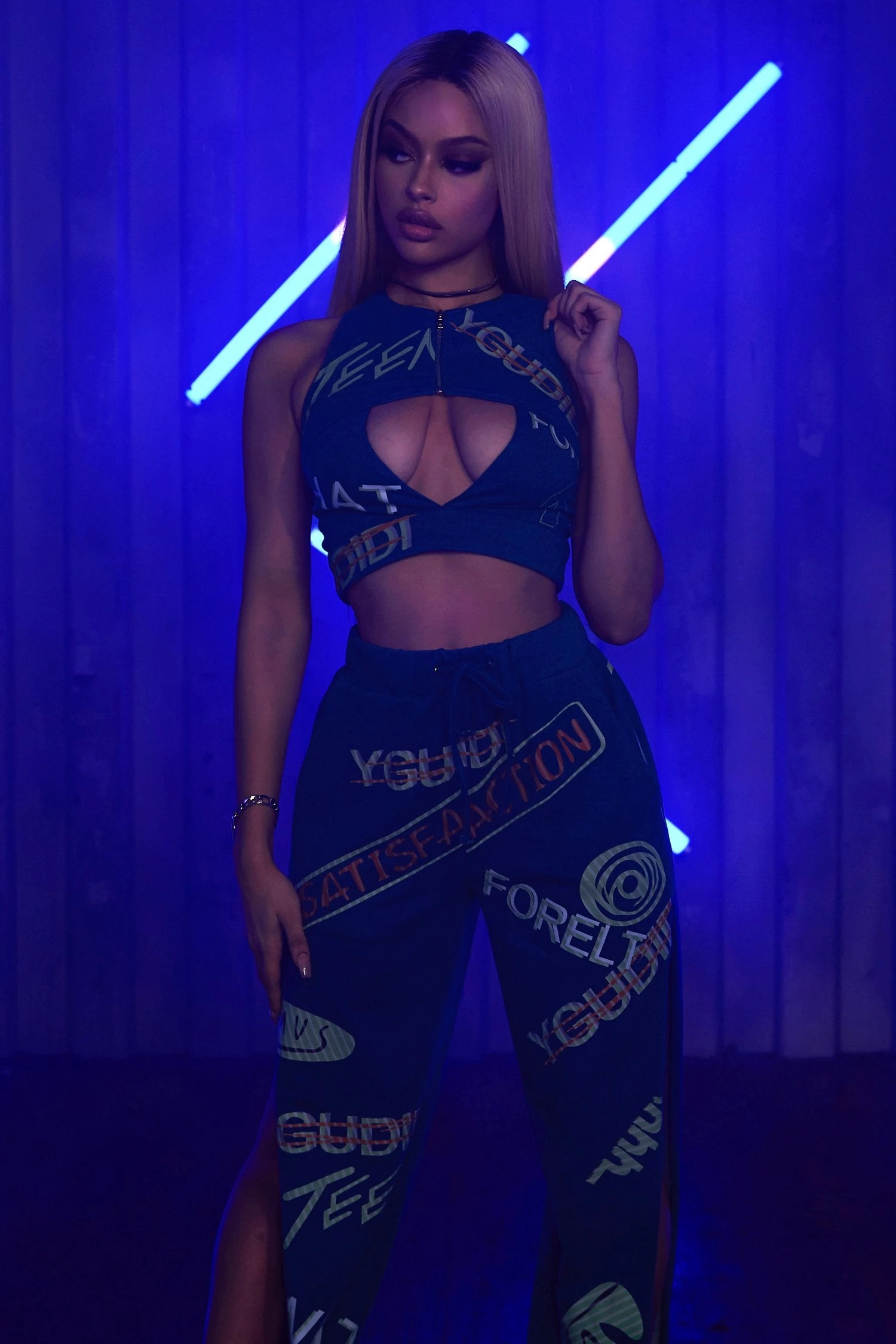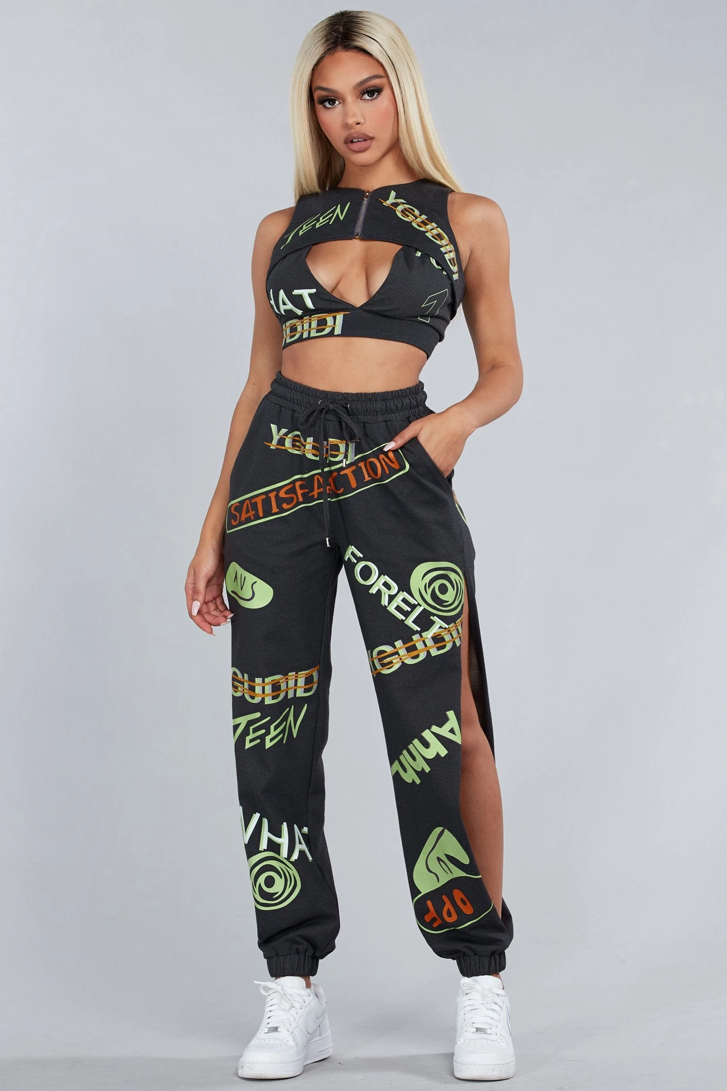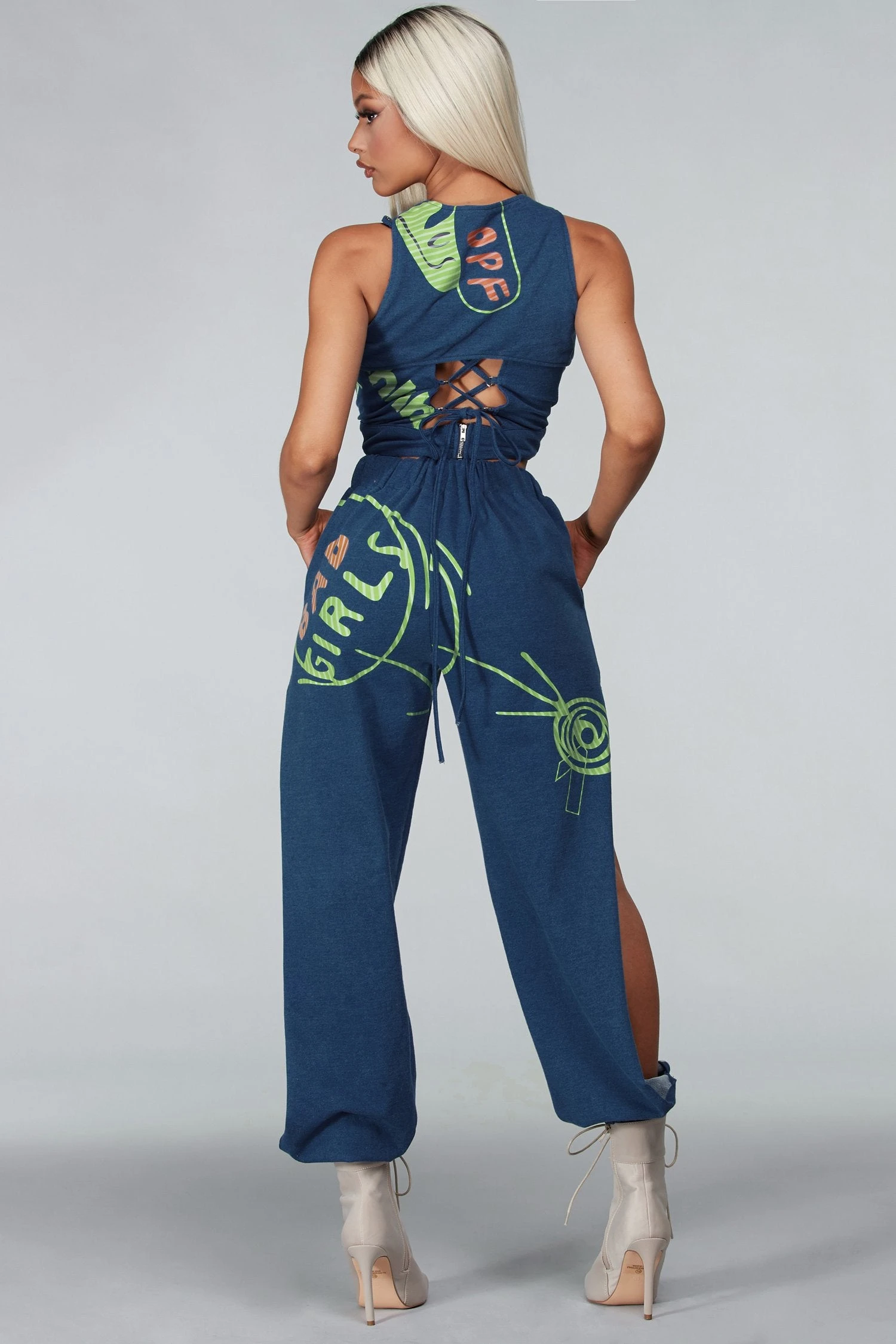 L’ensemble 3 pièces Denim Neon comprend : un haut court à col rond et zippé sur la poitrine se terminant par un pantalon de jogging assorti à une taille haute et des jambes de pantalon à découpe décontractée avec des poignets ajustés et élastiques. Deux poches avant.
