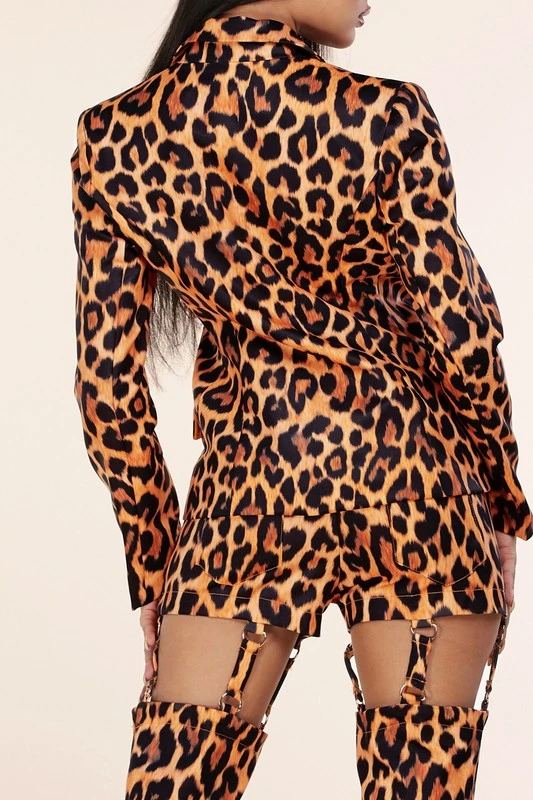 L’ensemble comprend un blazer à revers cranté à double bouton et un pantalon fuselé avec une boucle sexy à la cuisse.