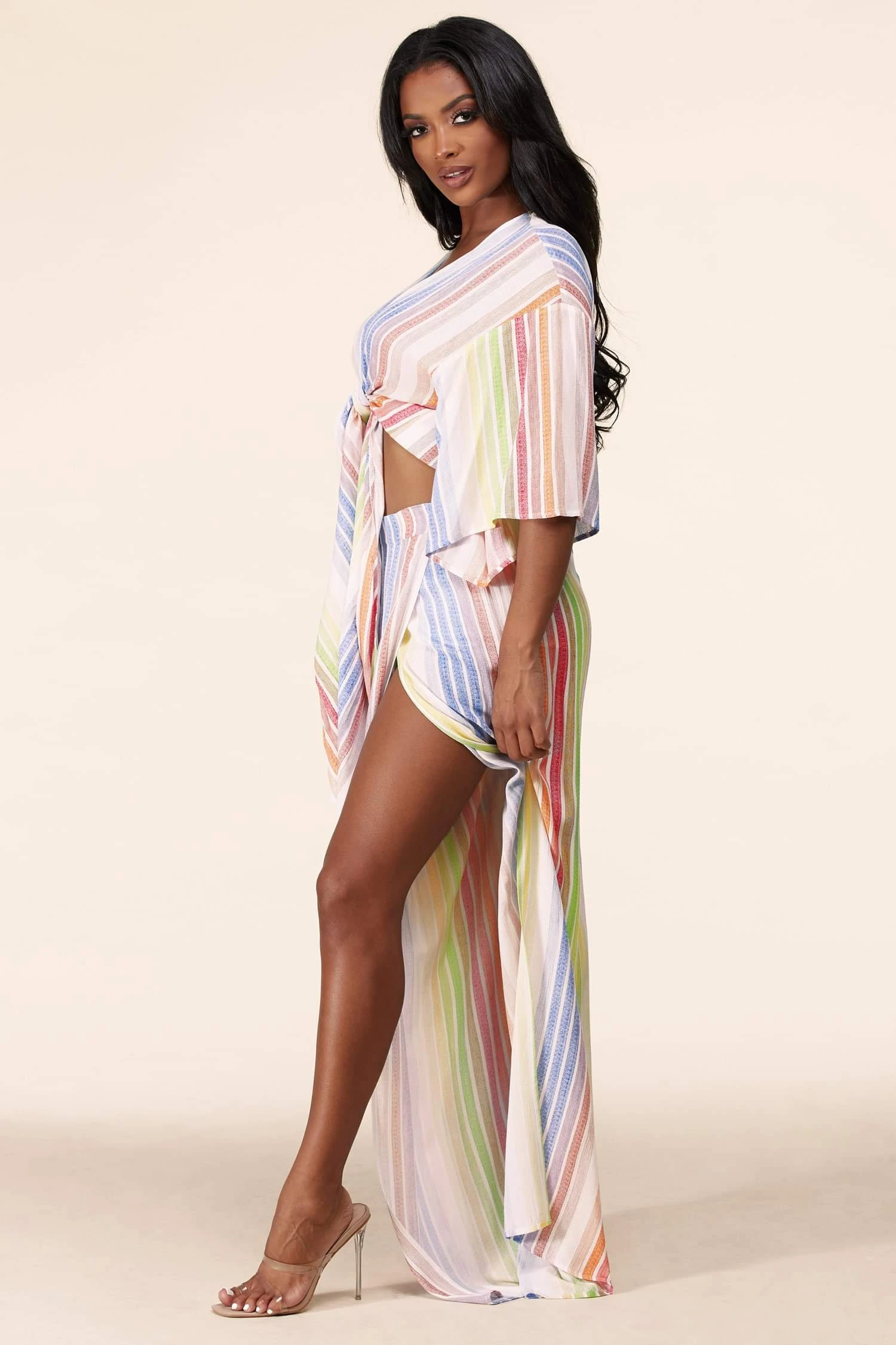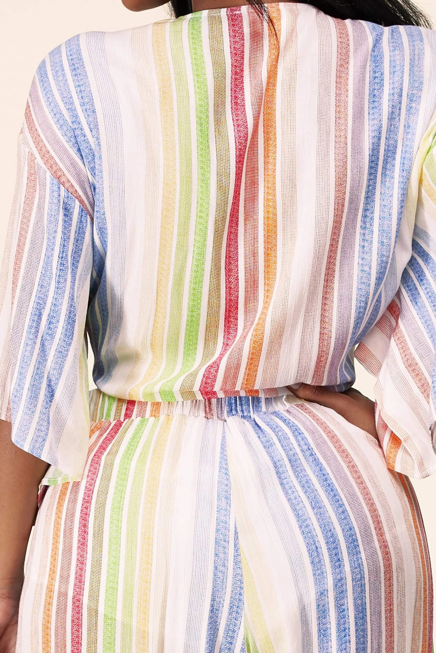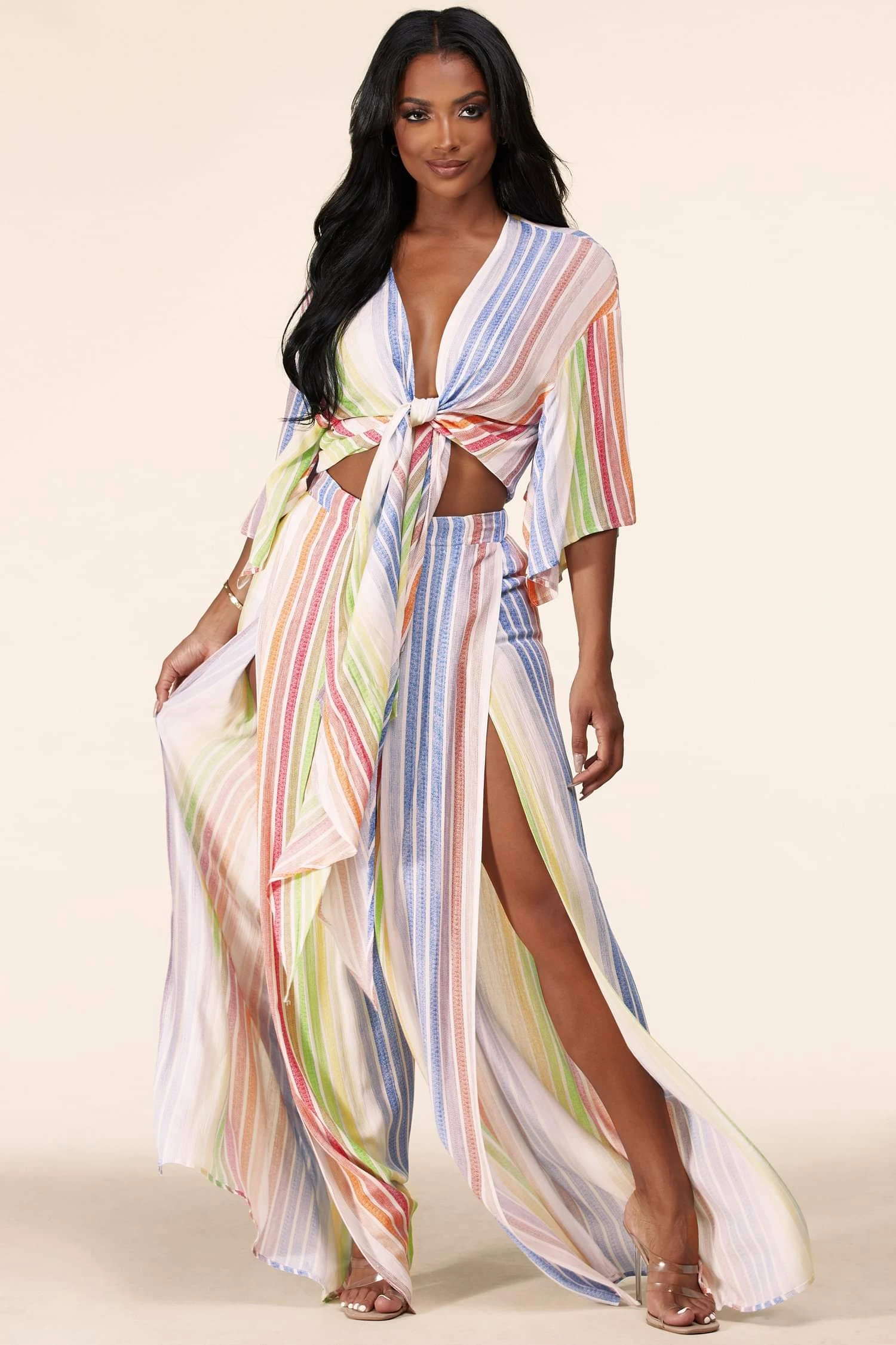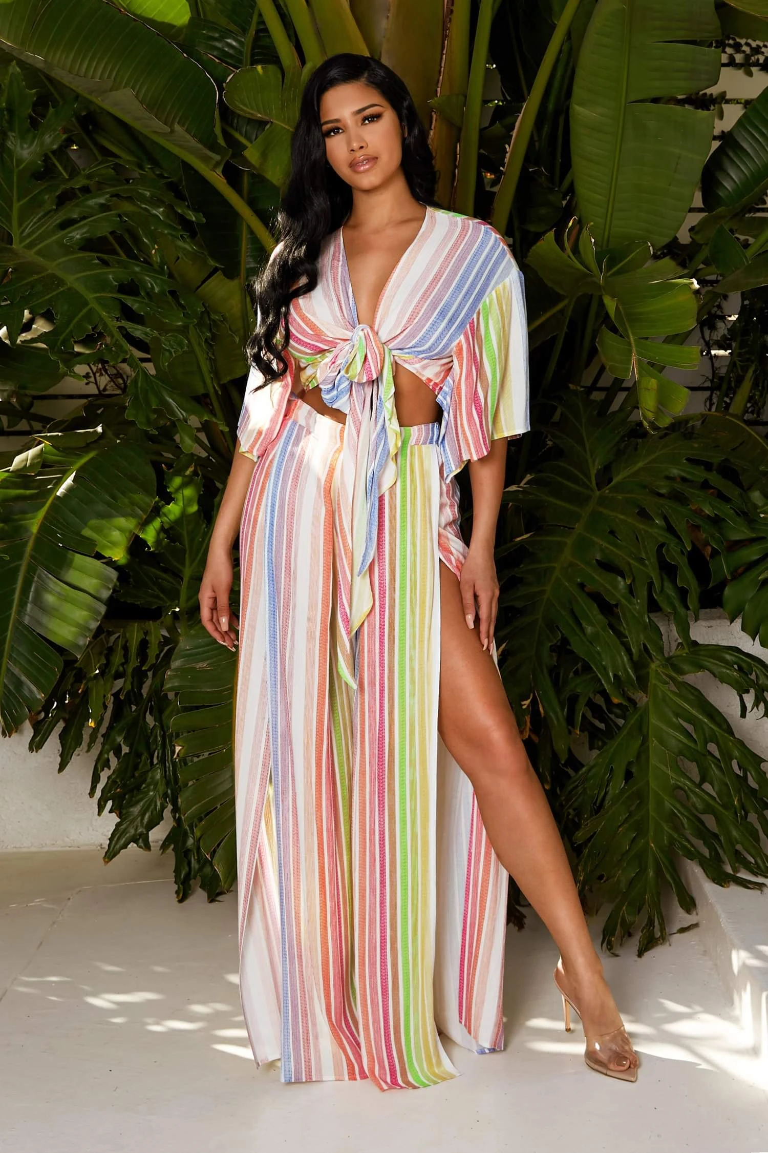 L’ensemble pantalon deux pièces à rayures pastel comprend un haut noué sur le devant flatteur avec des manches courtes décontractées et est associé à un pantalon palazzo assorti avec des fentes latérales audacieuses à hauteur des cuisses.