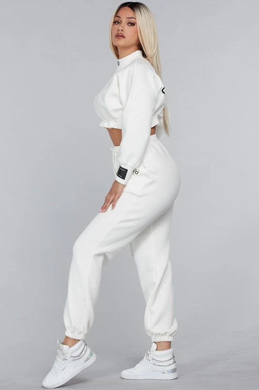 L’ensemble 2 PC adopte une approche haute couture . Le haut a un col montant et une ceinture courte unique réglable avec un cordon à nouer. Le poignet droit comporte une lecture de patch noir -Profitez de chaque instant -Collectionnez des moments, pas des choses Le pantalon en jogging à un patch noir assorti sur une poche plaquée latérale.