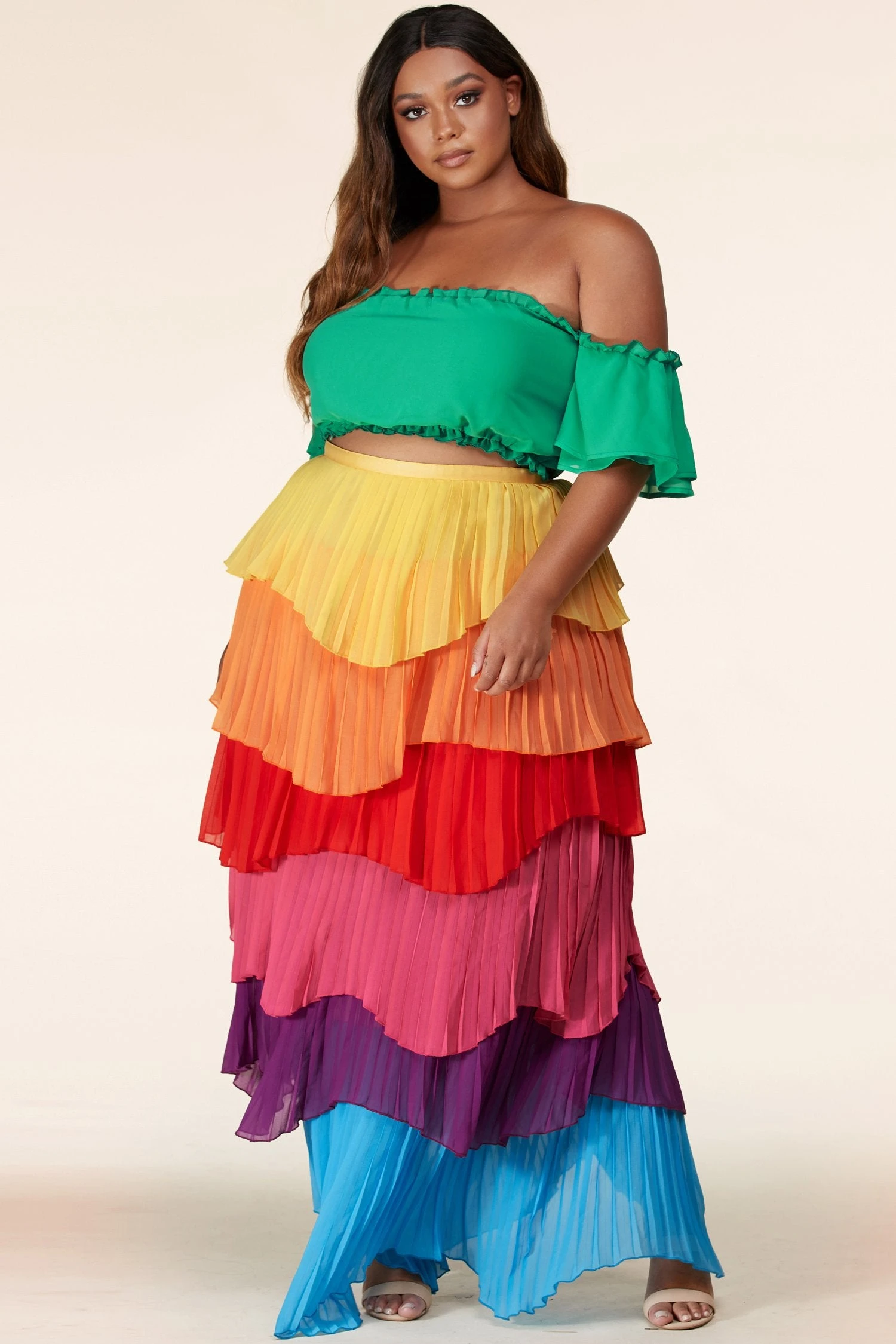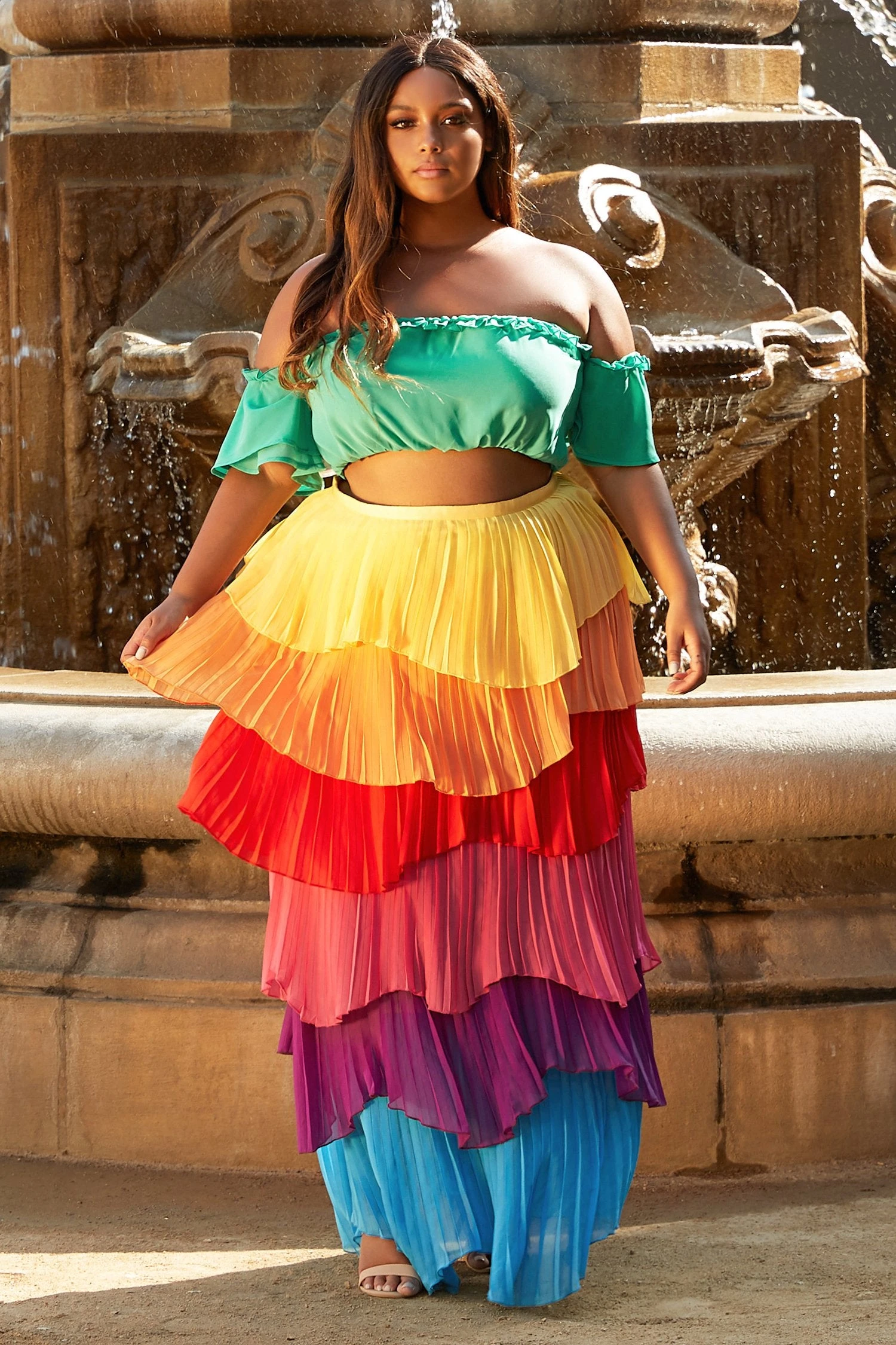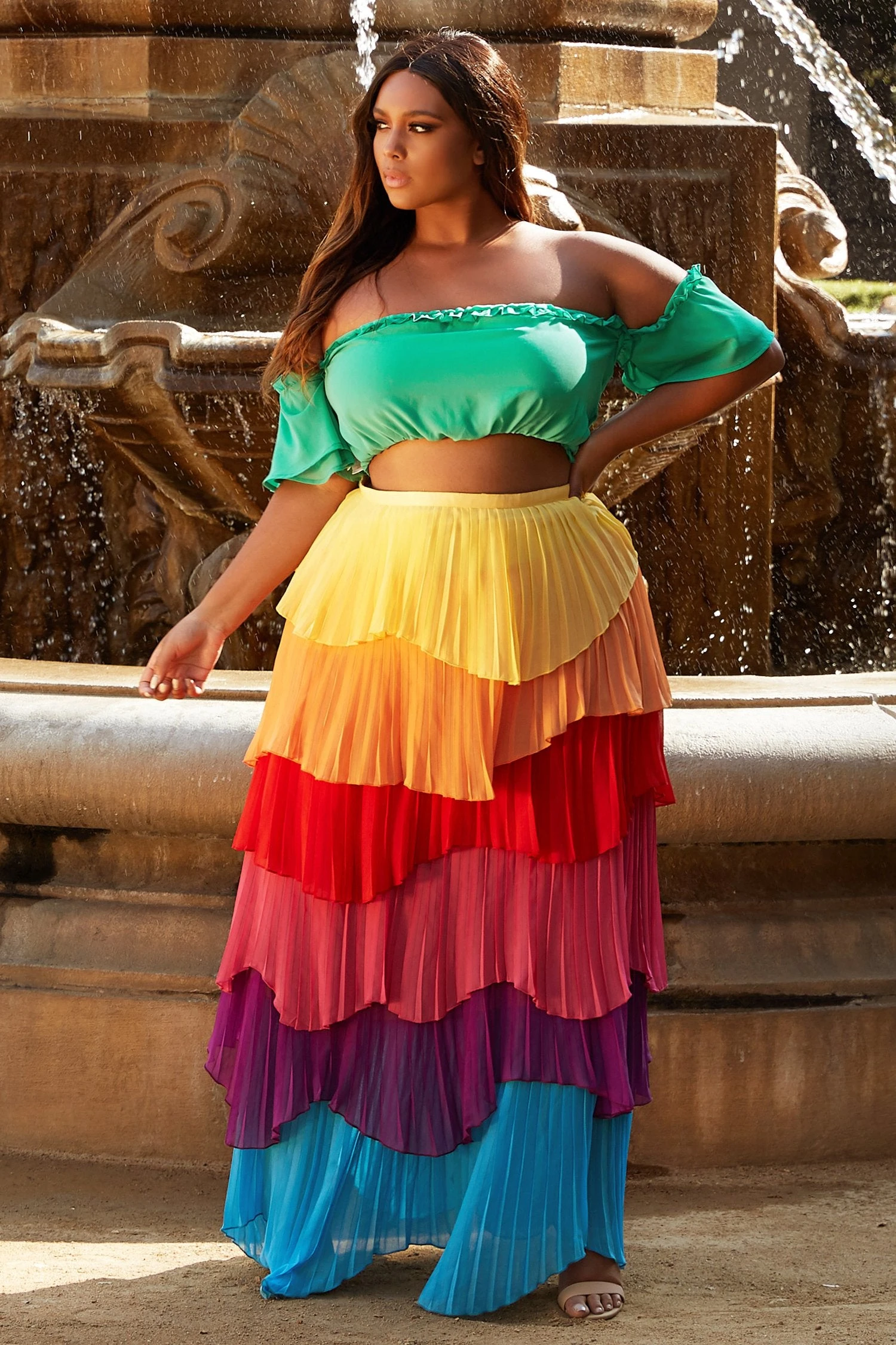Un top court à épaules dénudées avec un décolleté carré élastique, des détails de nouage dans le dos, des manches courtes flottantes et des détails à volants. Avec une jupe longue ajustée à taille haute avec une palette de couleurs vives.
