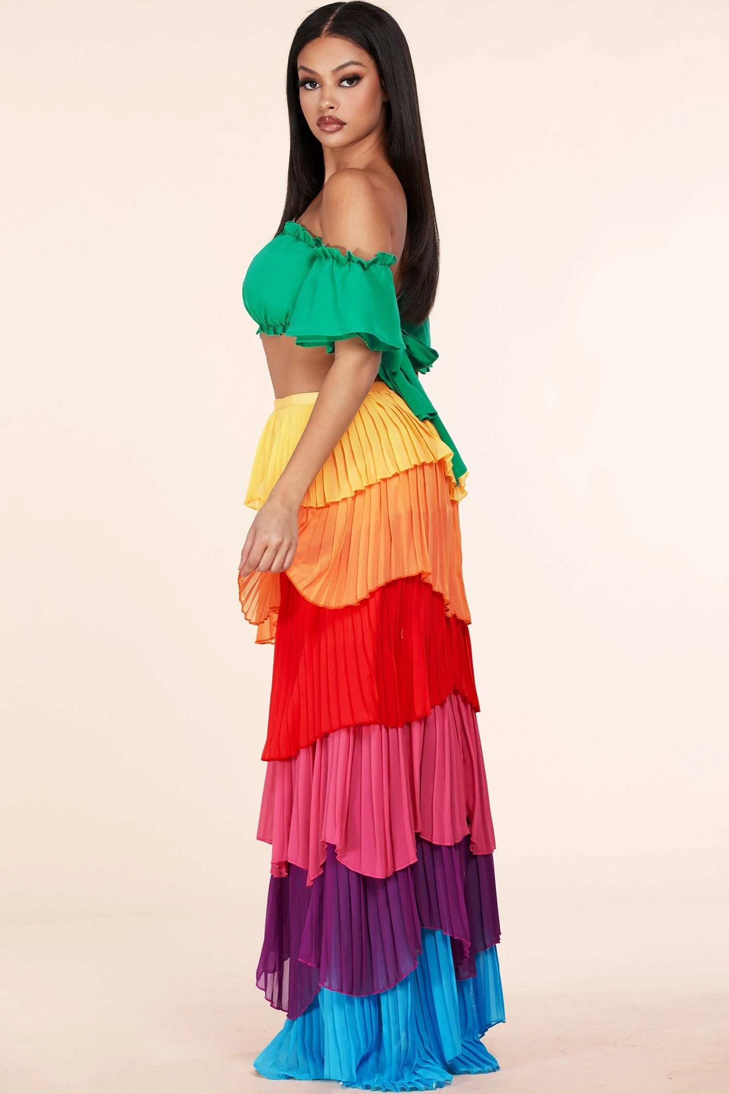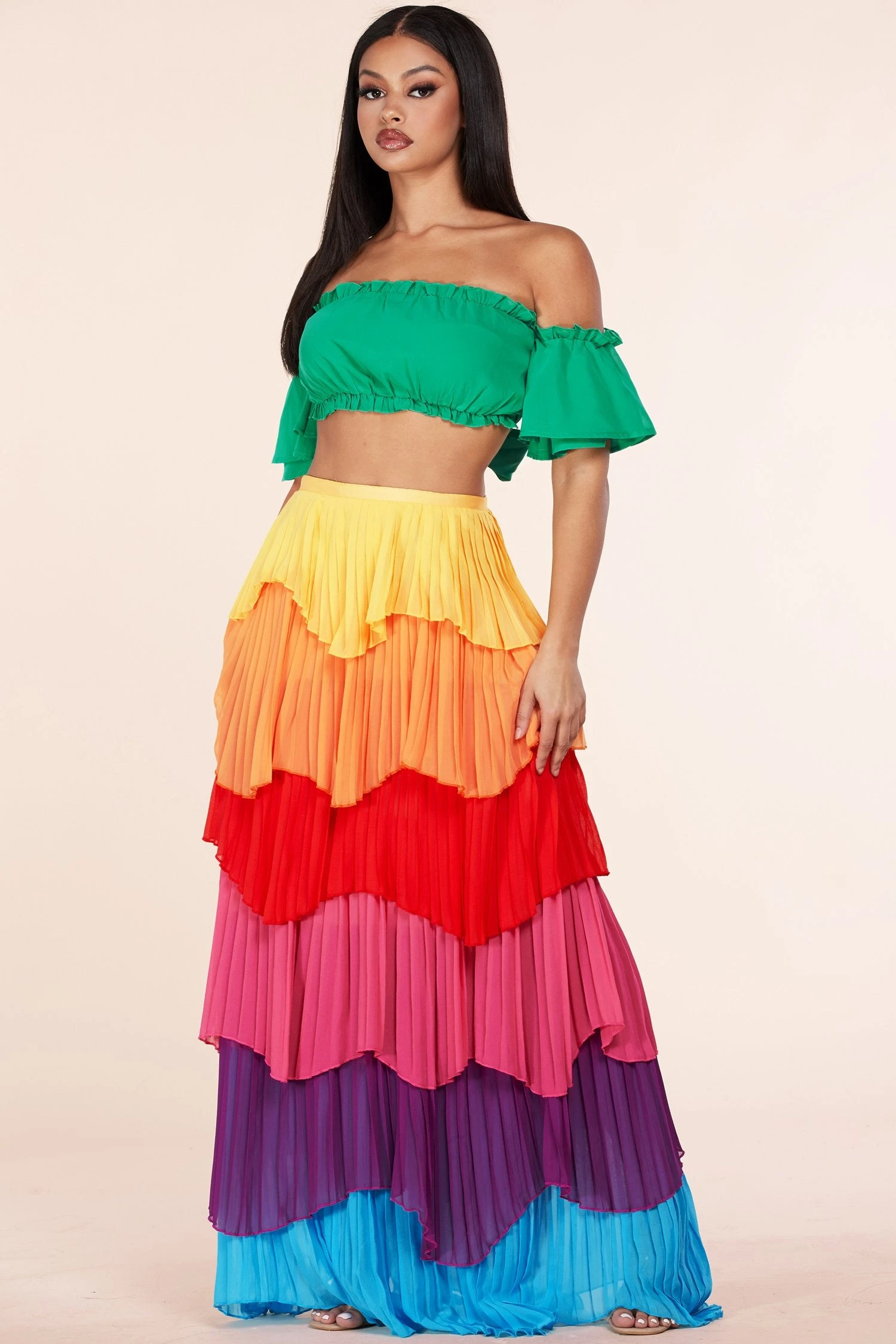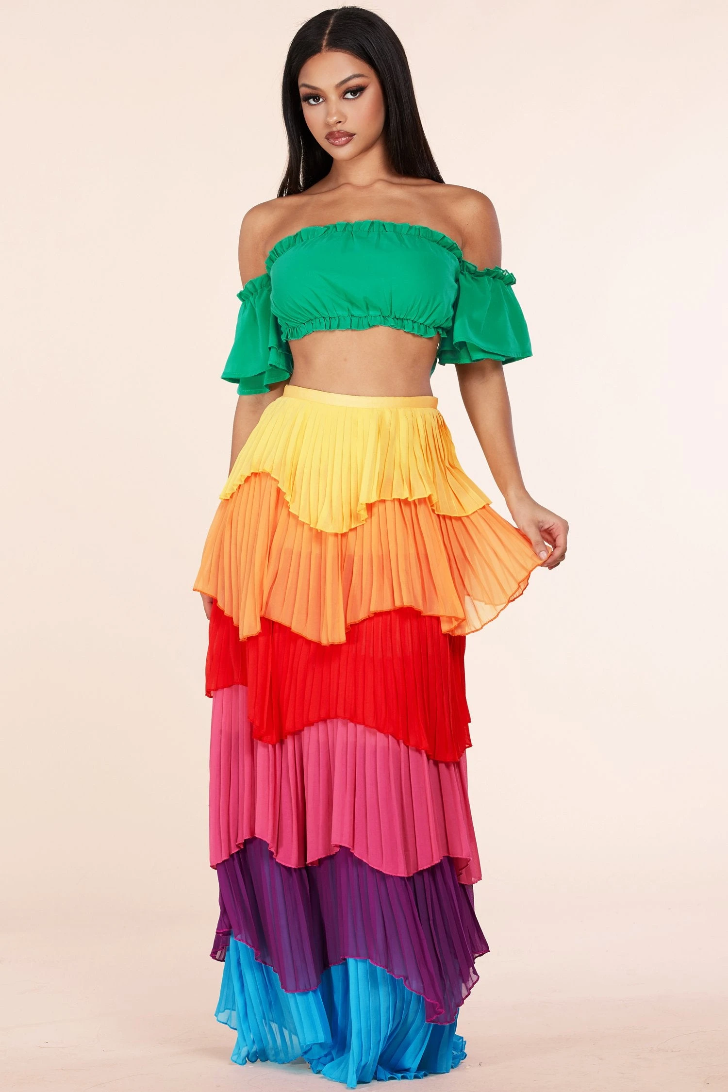 Un top court à épaules dénudées avec un décolleté carré élastique, des détails de nouage dans le dos, des manches courtes flottantes et des détails à volants. Avec une jupe longue ajustée à taille haute avec une palette de couleurs vives.