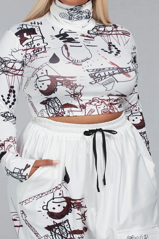 Ensemble deux pièces à col roulé et jogging court avec imprimé graphique bordeaux et noir. Le col roulé à manches longues avec un imprimé intégral se ferme dans le dos à partir de la moitié du cou. Les pantalons de jogging sont dotés d’une ceinture élastique épaisse avec des cordons de serrage noirs, de deux poches coupées et de diverses poches plaquées fonctionnelles sur les jambes.