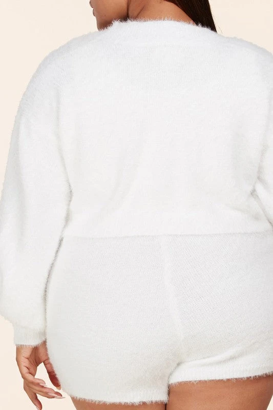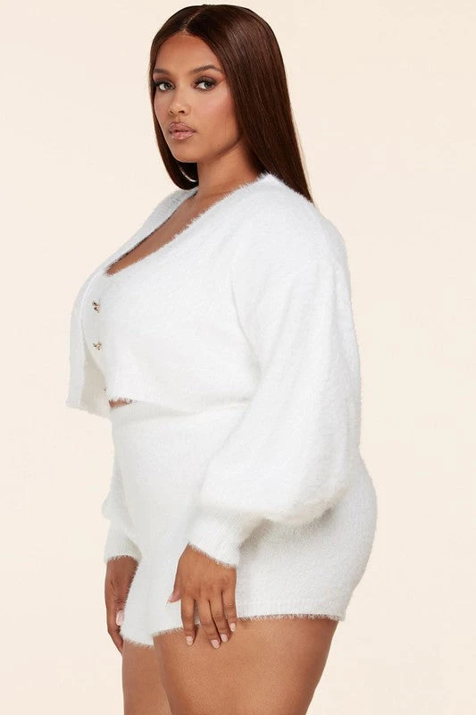 L’ensemble de vêtements de détente 3 pièces en tissu incroyablement doux et duveteux comprend un short ajusté, une brassière à encolure dégagée et un pull court sur le dessus. Le pull peut être porté ouvert ou boutonné.