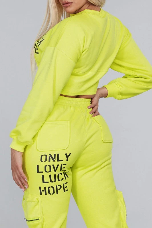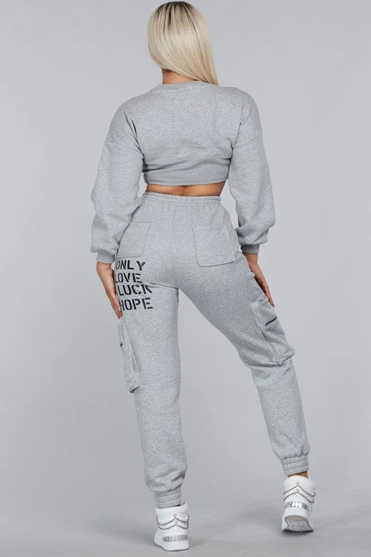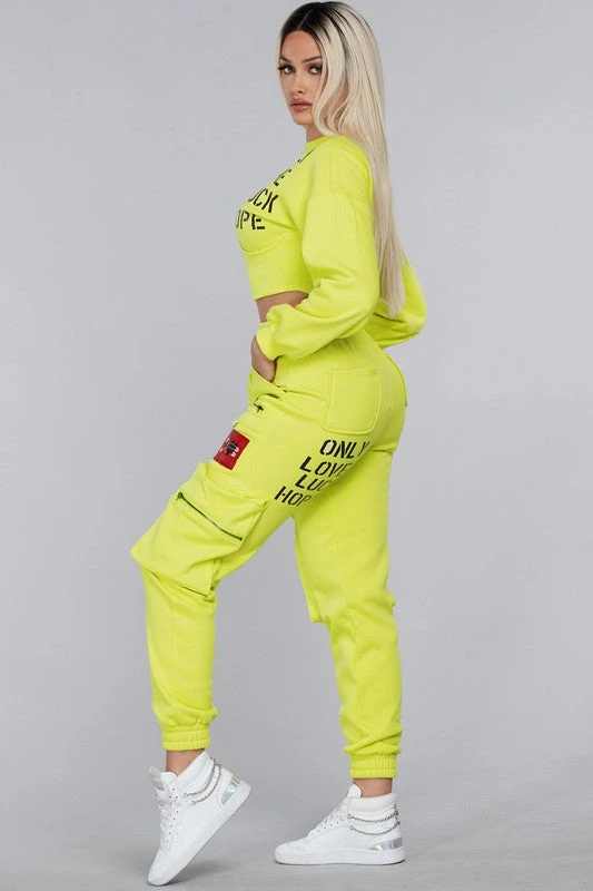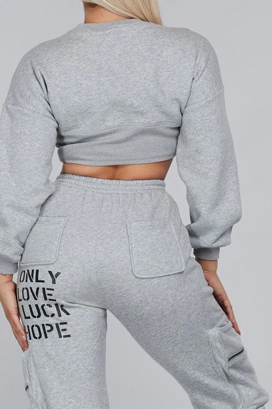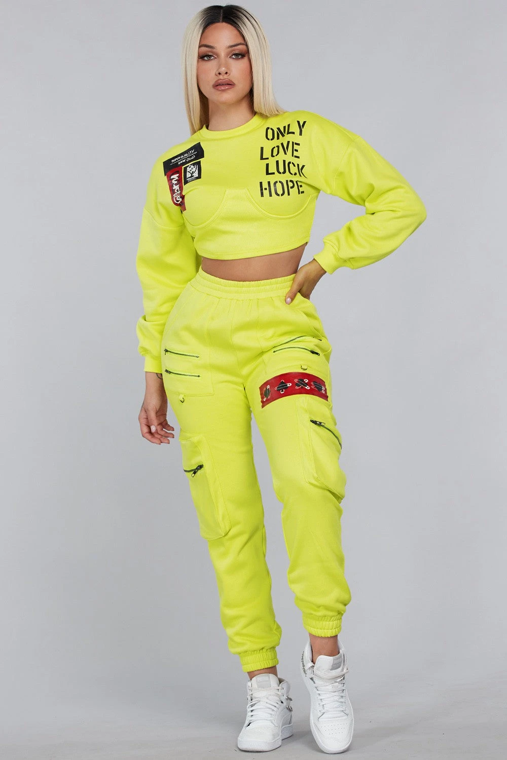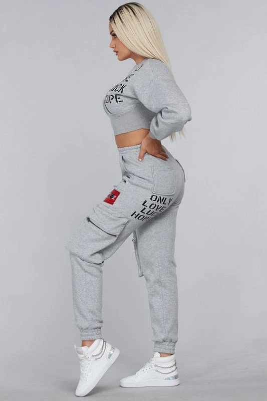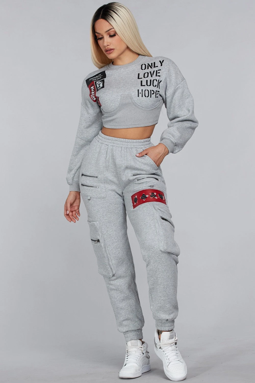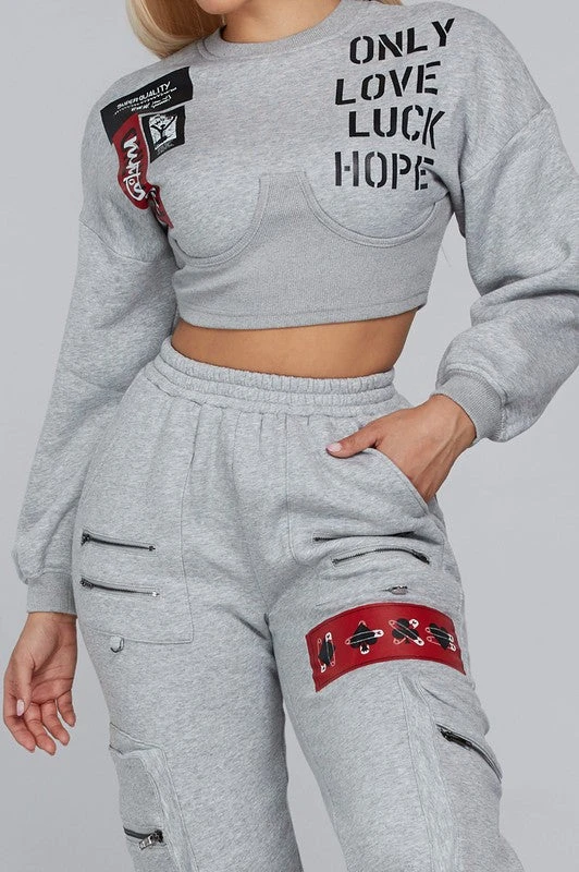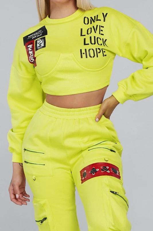 Cet ensemble pull court et jogger deux pièces est à la pointe des tendances et de la mode d’aujourd’hui avec le détail corset/bonnet côtelé du pull et son ourlet court . Des poches coupées et des poches plaquées avec des fermetures à glissière fonctionnelles ajoutent des détails supplémentaires à l’ensemble.