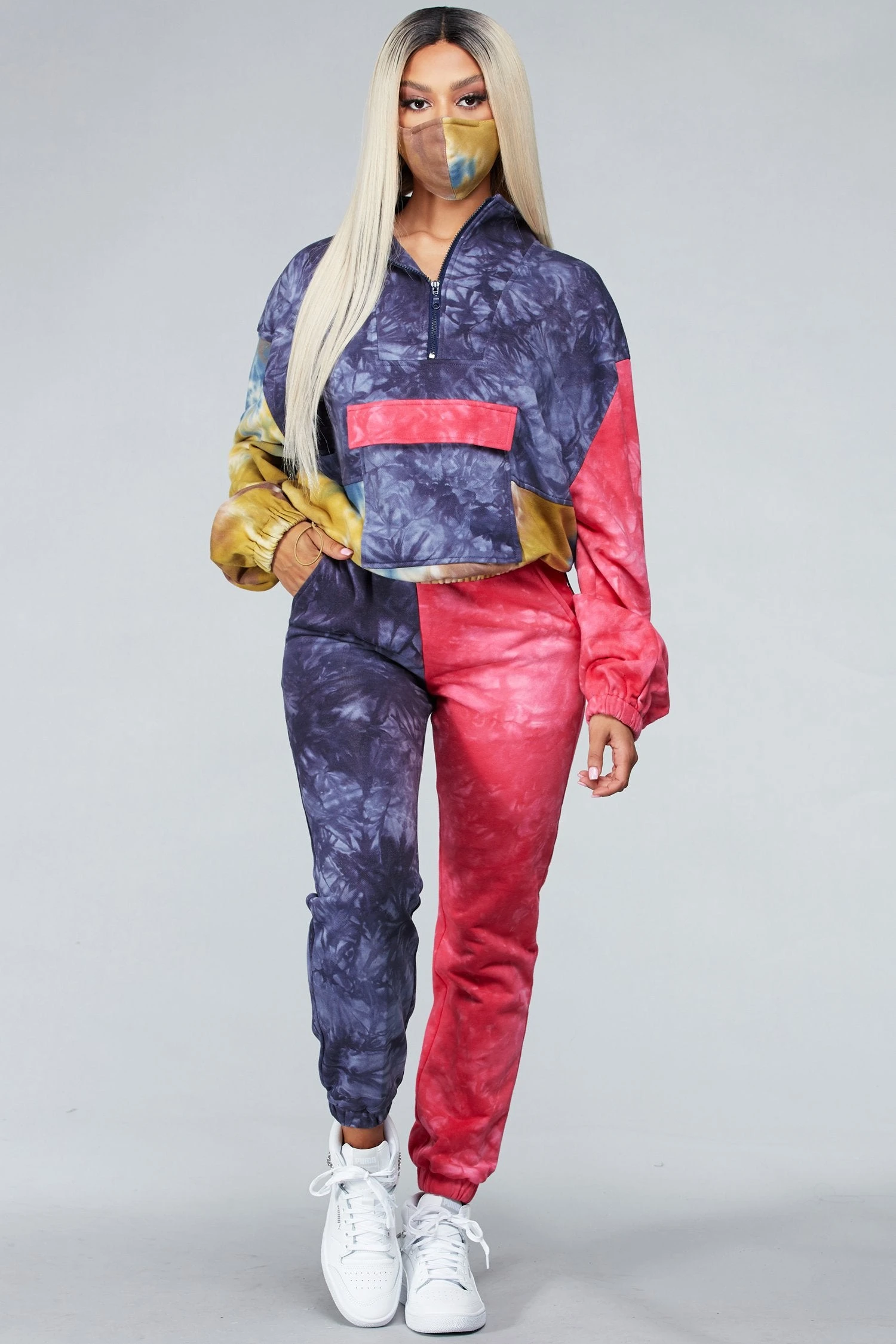Ensemble tie-dye assorti avec pull à col semi-zippé et poche kangourou sur le devant.