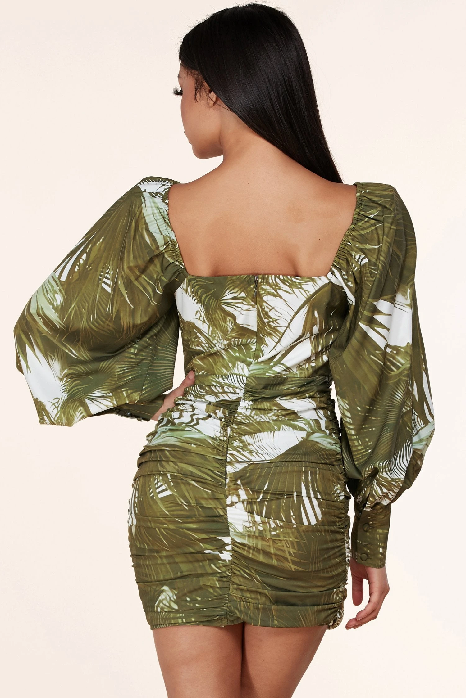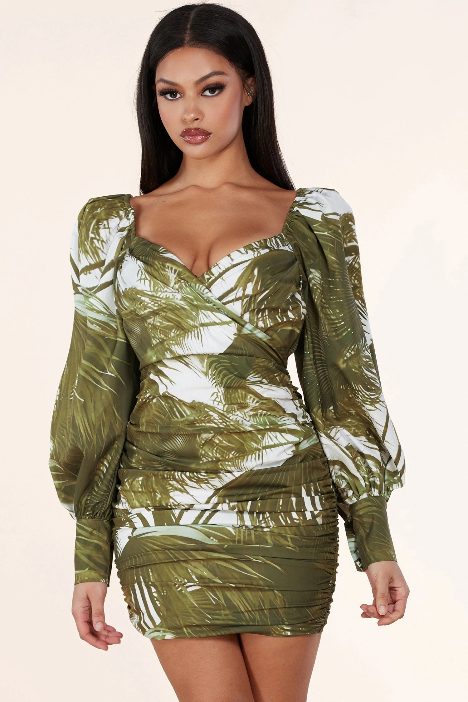 La mini-robe taille plus à imprimé de feuilles d’olivier forme un décolleté en cœur encadré de manches lanterne avec un élastique aux épaules. Un corsage décontracté, avec une silhouette froncée qui met en valeur la silhouette avec un mini ourlet séduisant.