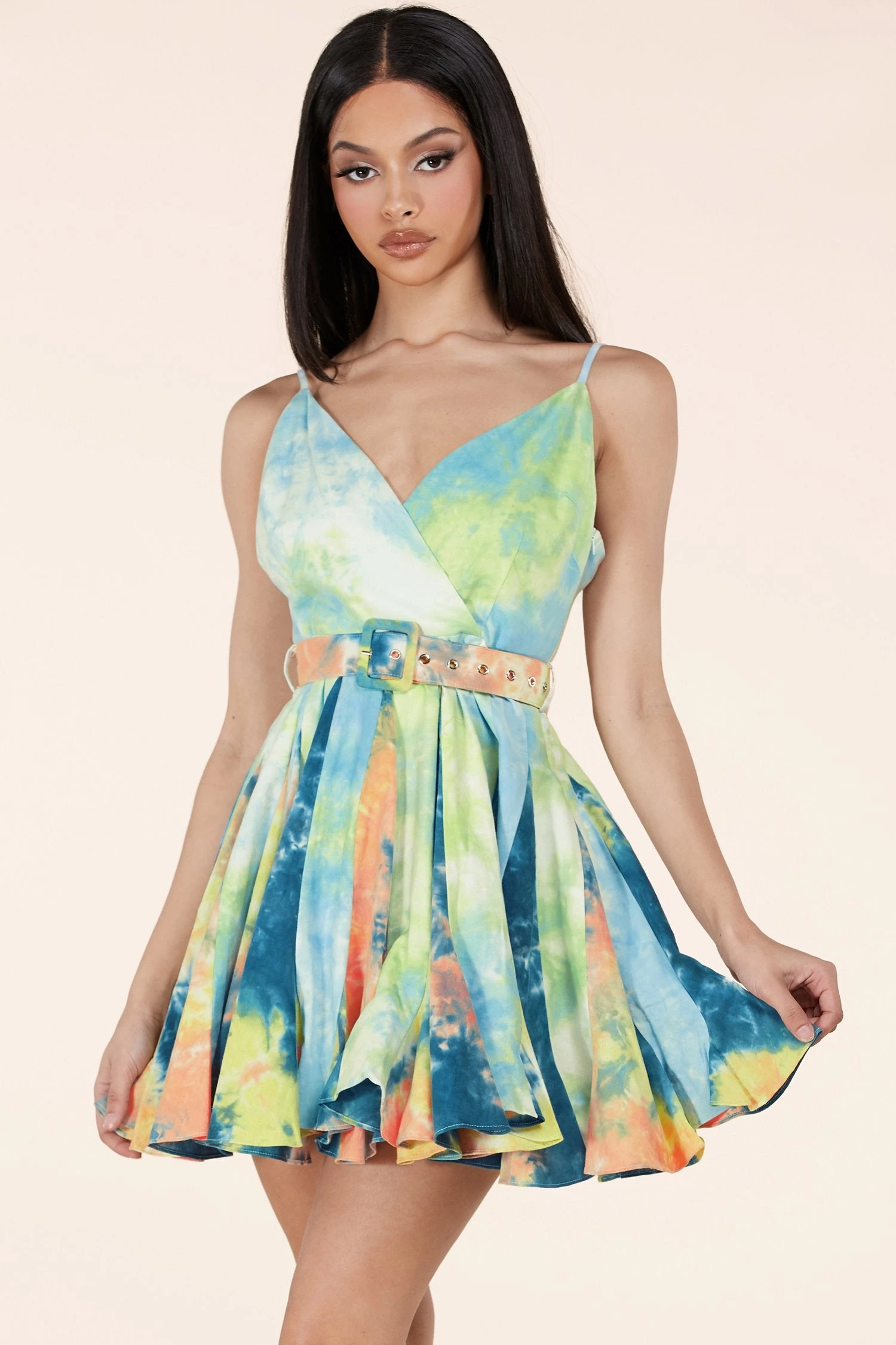 La mini-robe tie-dye présente un décolleté en surplis et une jupe évasée ainsi qu’un mini ourlet avec une ceinture amovible.