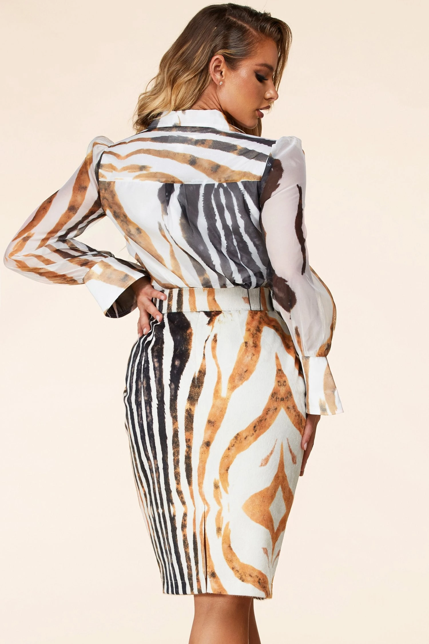 L’ensemble jupe mi-longue à imprimé zèbre rouillé comprend un chemisier à imprimé zèbre avec un devant boutonné, un décolleté à col, des manches cloche et est associé à une jupe mi-longue en faux crin de cheval complétée par une ceinture assortie.
