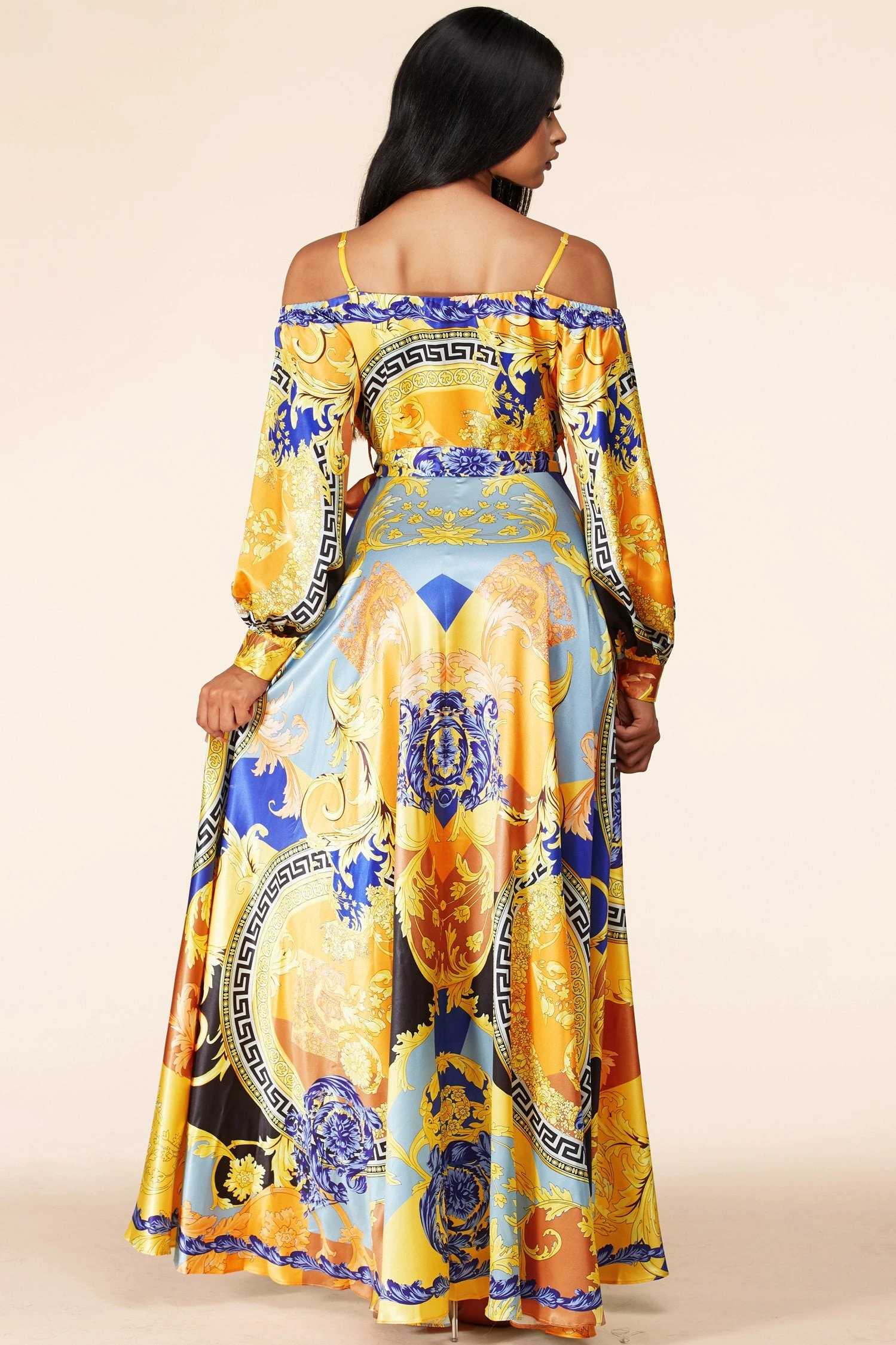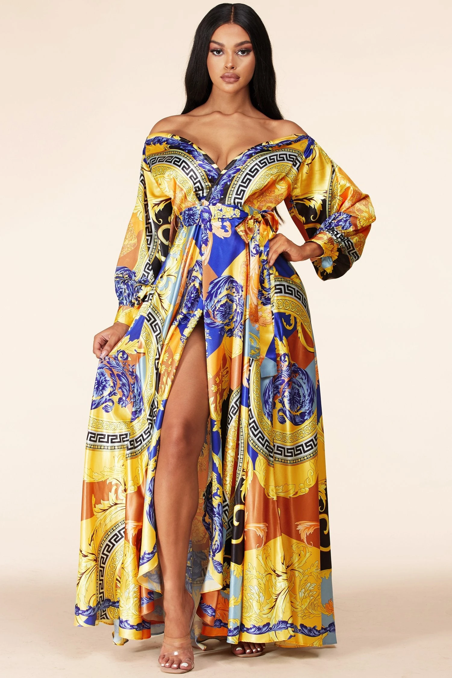 La robe longue à épaules dénudées présente une encolure en cœur à épaules dénudées et des bretelles spaghetti réglables qui créent un look d’épaule froide avec des manches longues et un corsage à couture princesse à deux plis avec une magnifique jupe longue suivie d’une cuisse sensuelle. fente latérale haute.