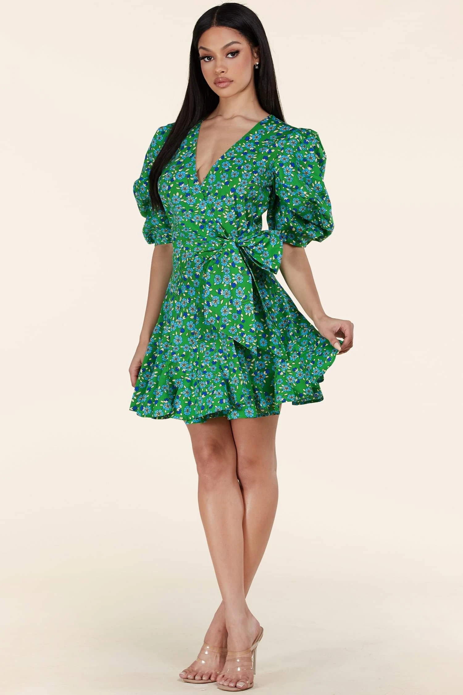 La mini-robe verte à imprimé floral Ditsy est en coton, avec des manches courtes bouffantes et un corsage surplis qui tombe dans une jupe mini godet enveloppante.