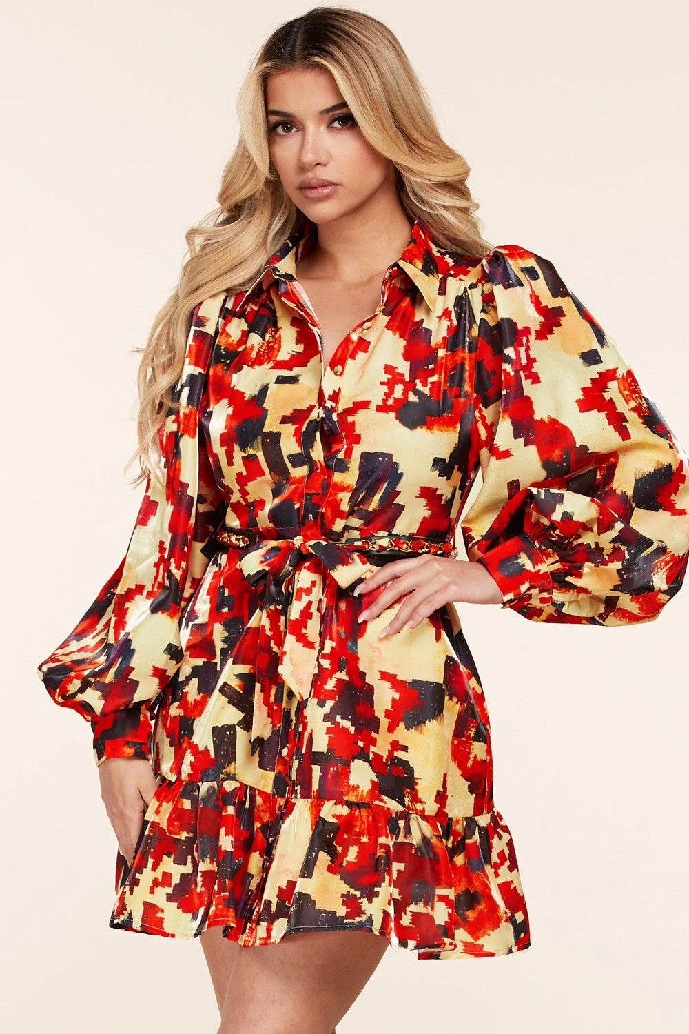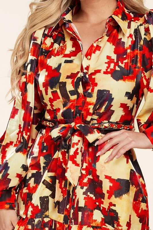 Mini-robe à manches longues avec boutons imprimés abstraits jusqu’à un col à col. Manches lanternes boutonnées au poignet. Une ceinture en cuir avec une chaîne dorée et des liens en tissu assortis à la taille et une jupe à ourlet évasé.