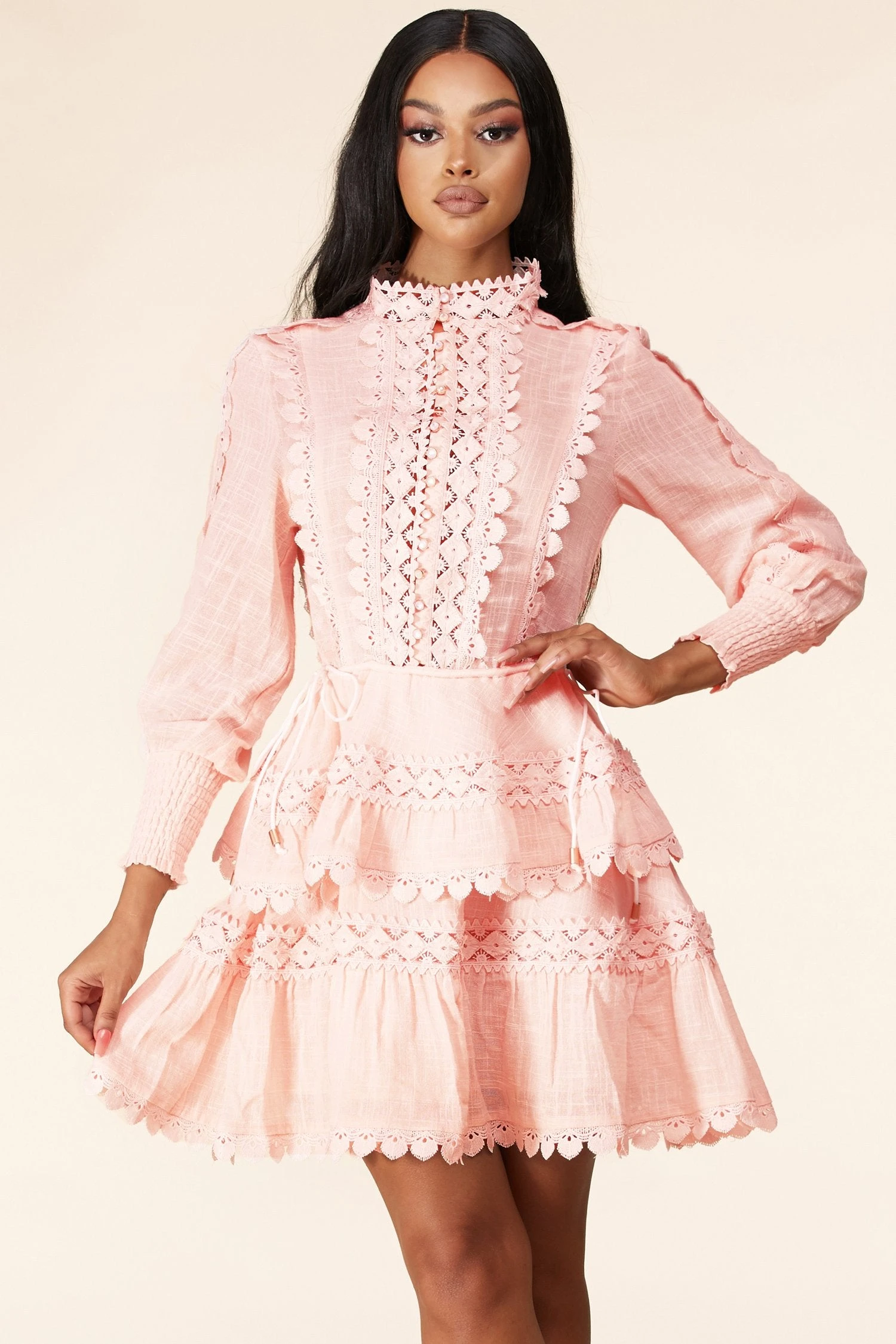 Mini-robe en dentelle brodée à manches longues et col montant recouvert de bordures brodées audacieuses, avec un col montant avec bordure en crochet, manches longues, finies avec des poignets .