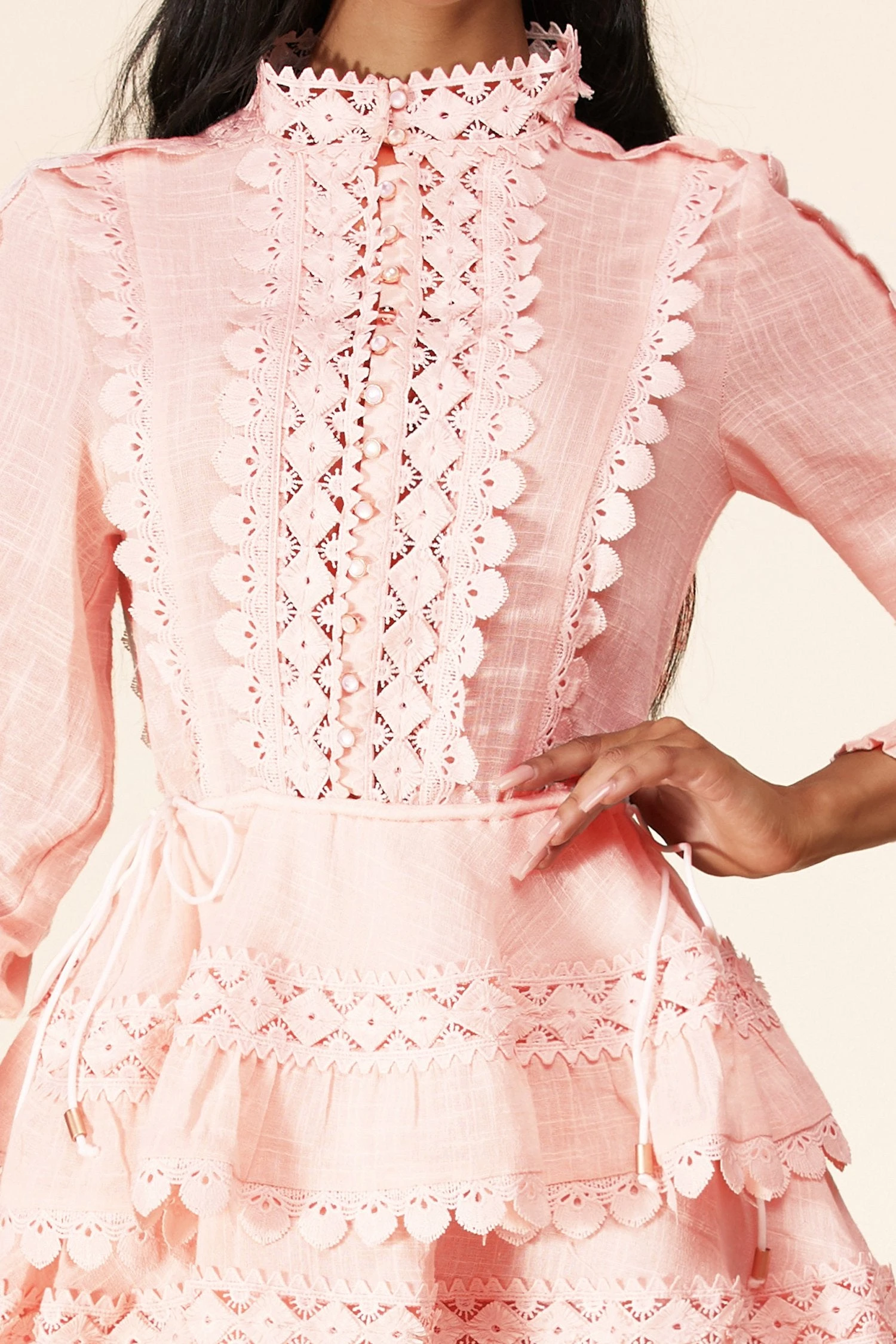 La dentelle au crochet transparente accentue les épaules et le corsage, rejoignant une taille ajustée, sur une mini-jupe trapèze avec un ourlet à volants flirty, terminée par une bordure en dentelle au crochet festonnée.