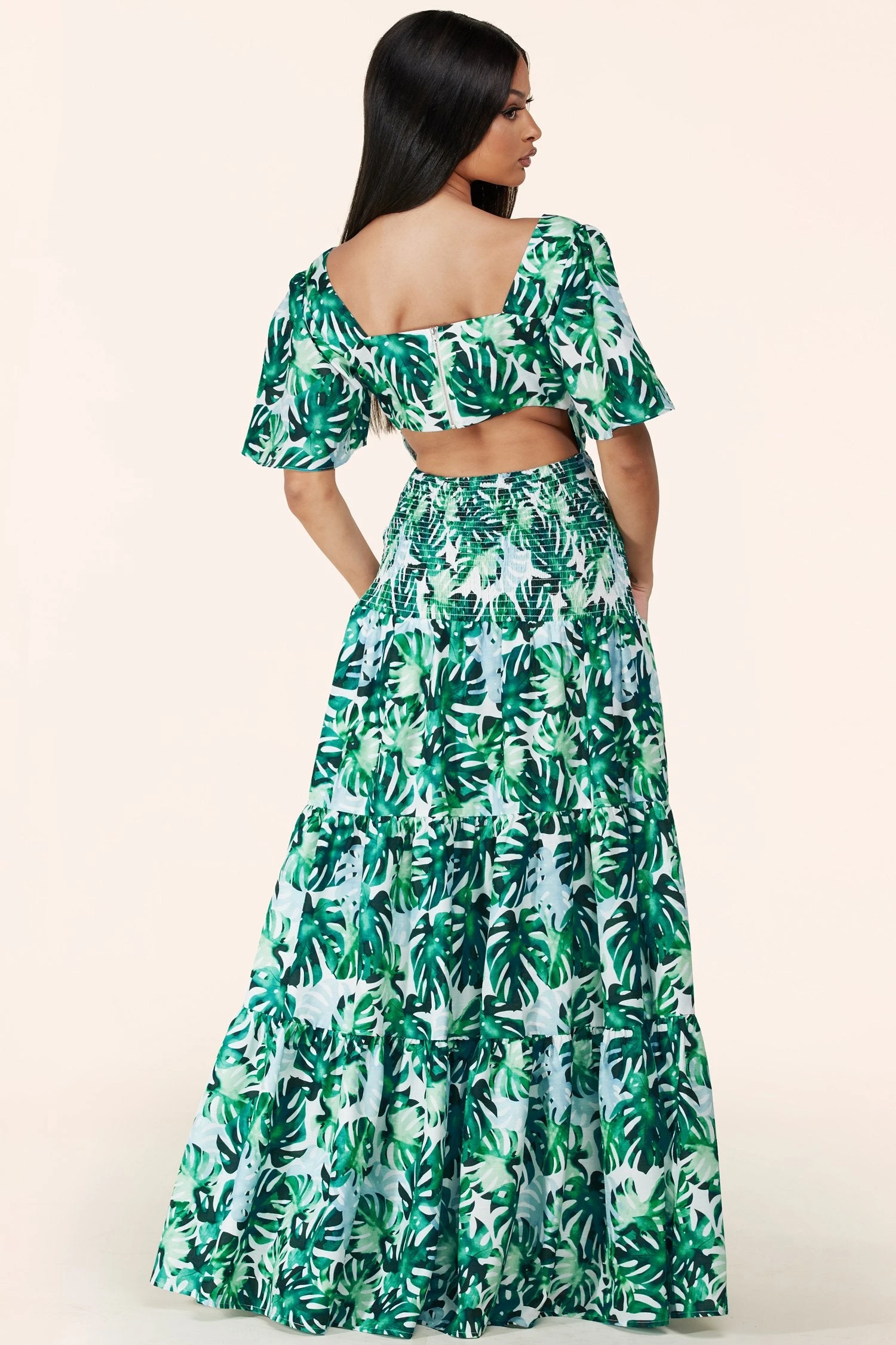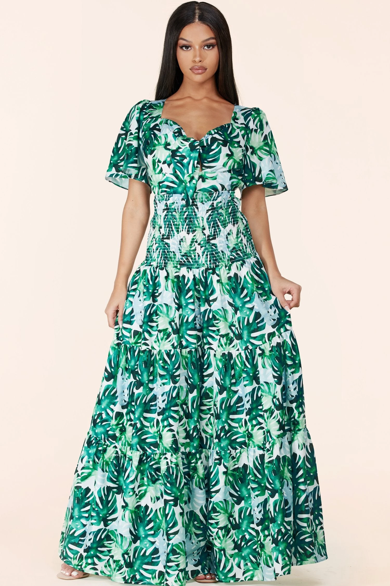 La robe longue nouée à l’avant de la feuille tropicale forme des manches courtes, un décolleté en V plongeant, un corsage noué avec une découpe sur le devant.