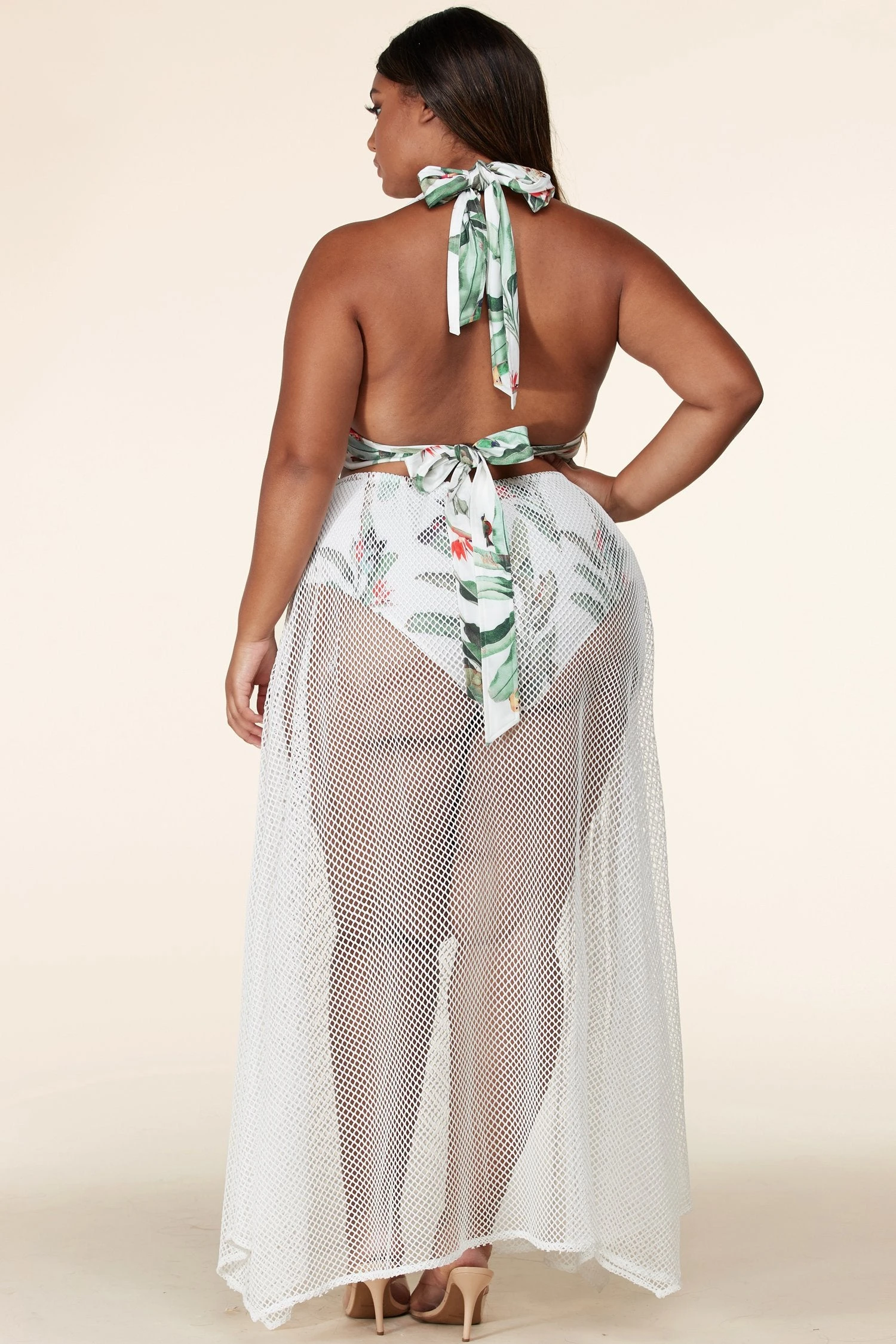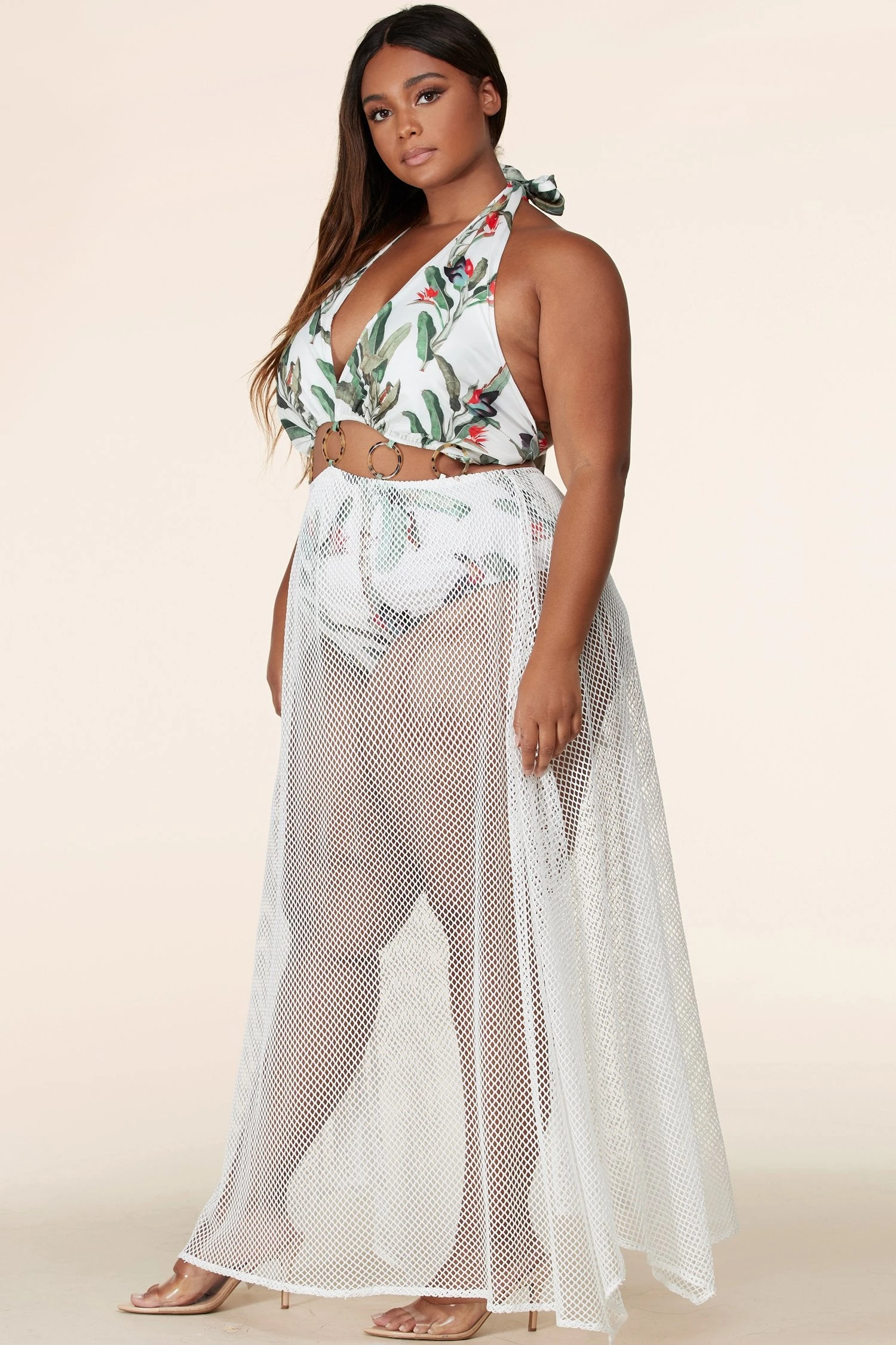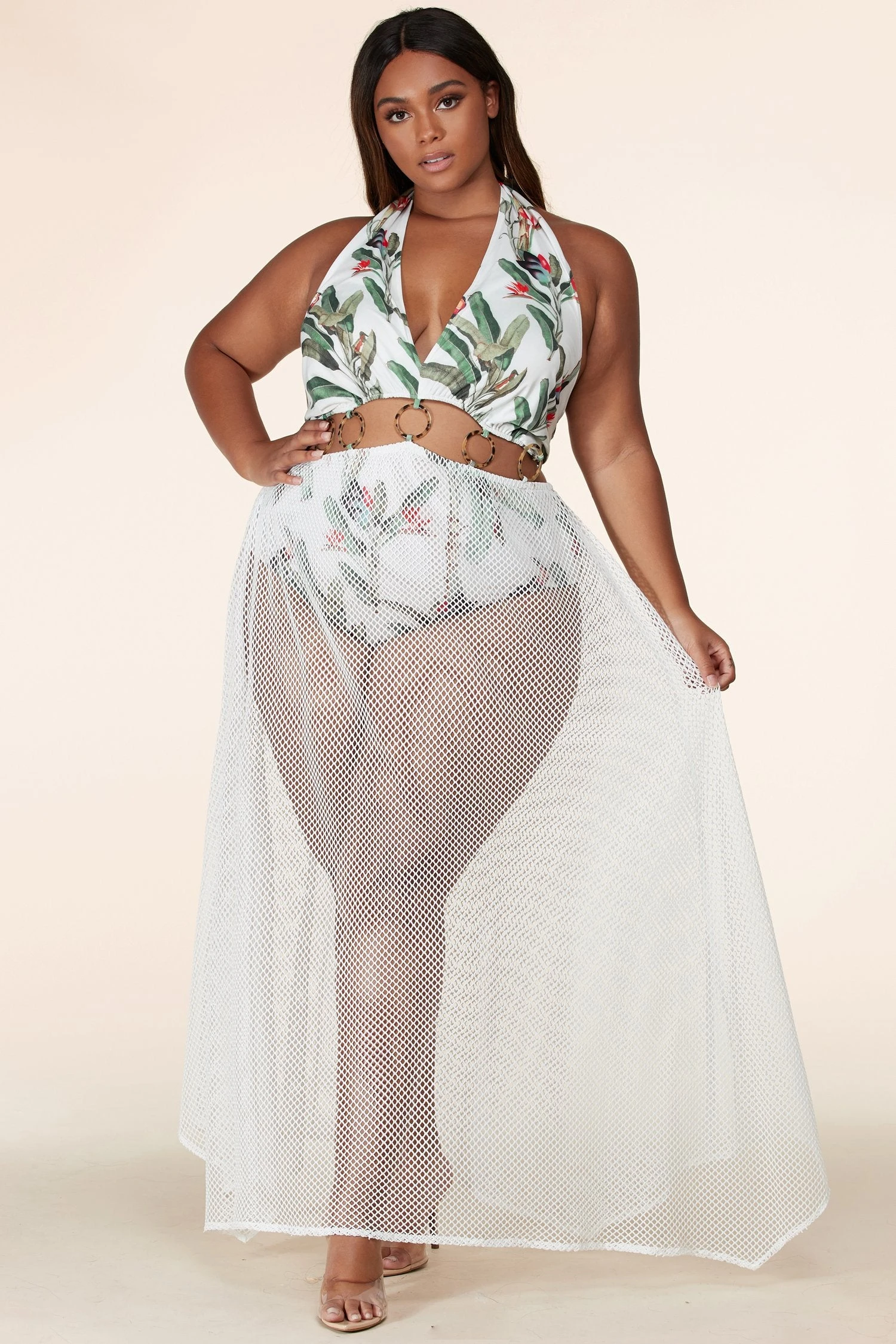 La robe longue à imprimé fleur tropicale comprend un corsage de style monokini avec un col licou à nouer, une découpe sexy dans la partie médiane ornée de bordures annulaires et une jupe longue superposée en résille blanche.
