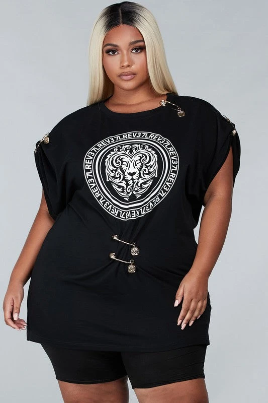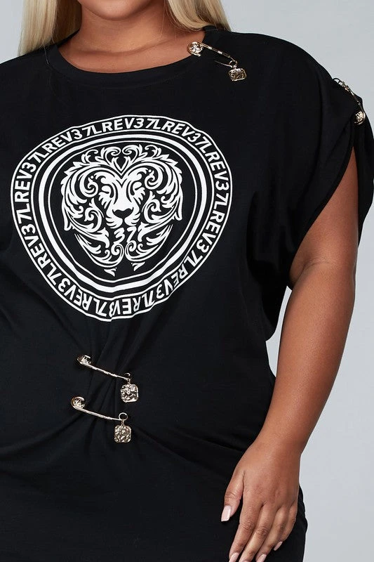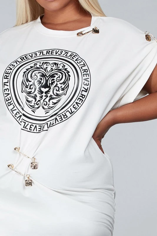 Robe t-shirt à épingle à nourrice Comporte des manches courtes, une silhouette longue, un col ras du cou et un embellissement du logo de tête de lion et des détails d’épingle à nourrice dorées sur l’ensemble.